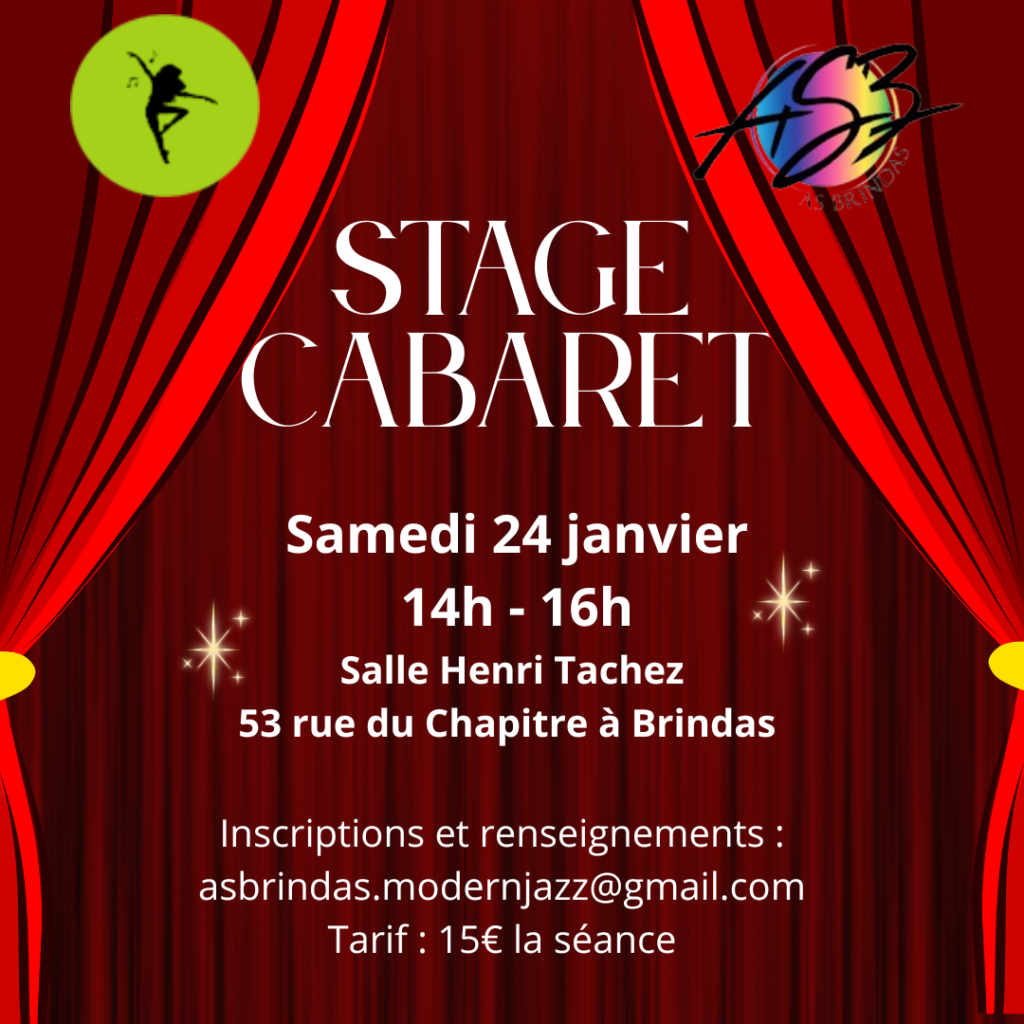 Pour bien commencer l’année, la section Modern Jazz vous propose un stage de danse cabaret ouvert aux débutants ! N’hésitez pas à vous inscrire : asbrindas.modernjazz@gmail.com